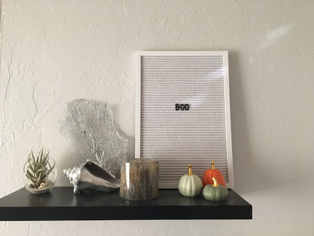 Lastly, my mom found the spider decoration on Pinterest and it is so simple. It requires 8 pieces of black streamers and 1 non-helium balloon, tape it all together in a corner and you have a creepy little visitor! How do you decorate for Halloween?