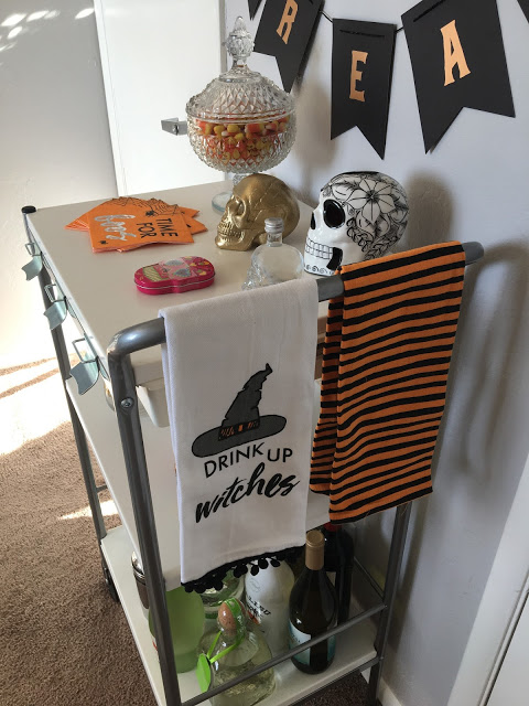 My favorite part of upcoming holidays is changing up my bar cart decor. I spent the past two years finding little things to add to my collection until I could finally have the cart in my room. Now it\’s in my room and looking spookier than ever this month!