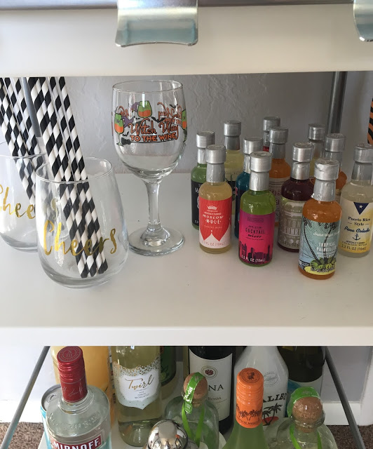 October\’s cart features two Halloween themed tea towels, a candy corn filled dish, sassy napkins, a few decorative skulls, glasses, and of course liquor (look how cute the global mixer set is)! My favorite place to find holiday items to add is the Target dollar section, but I\’ve also linked some similar items I love that can be ordered at the bottom and the Swoozie\’s website has tons of goodies too.