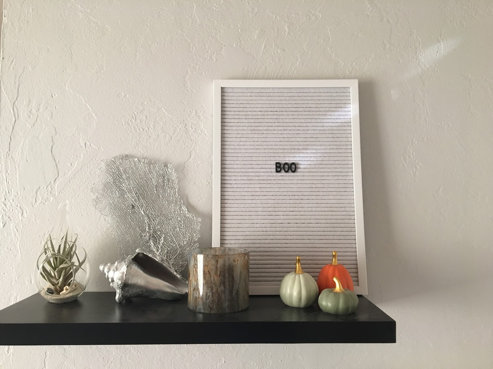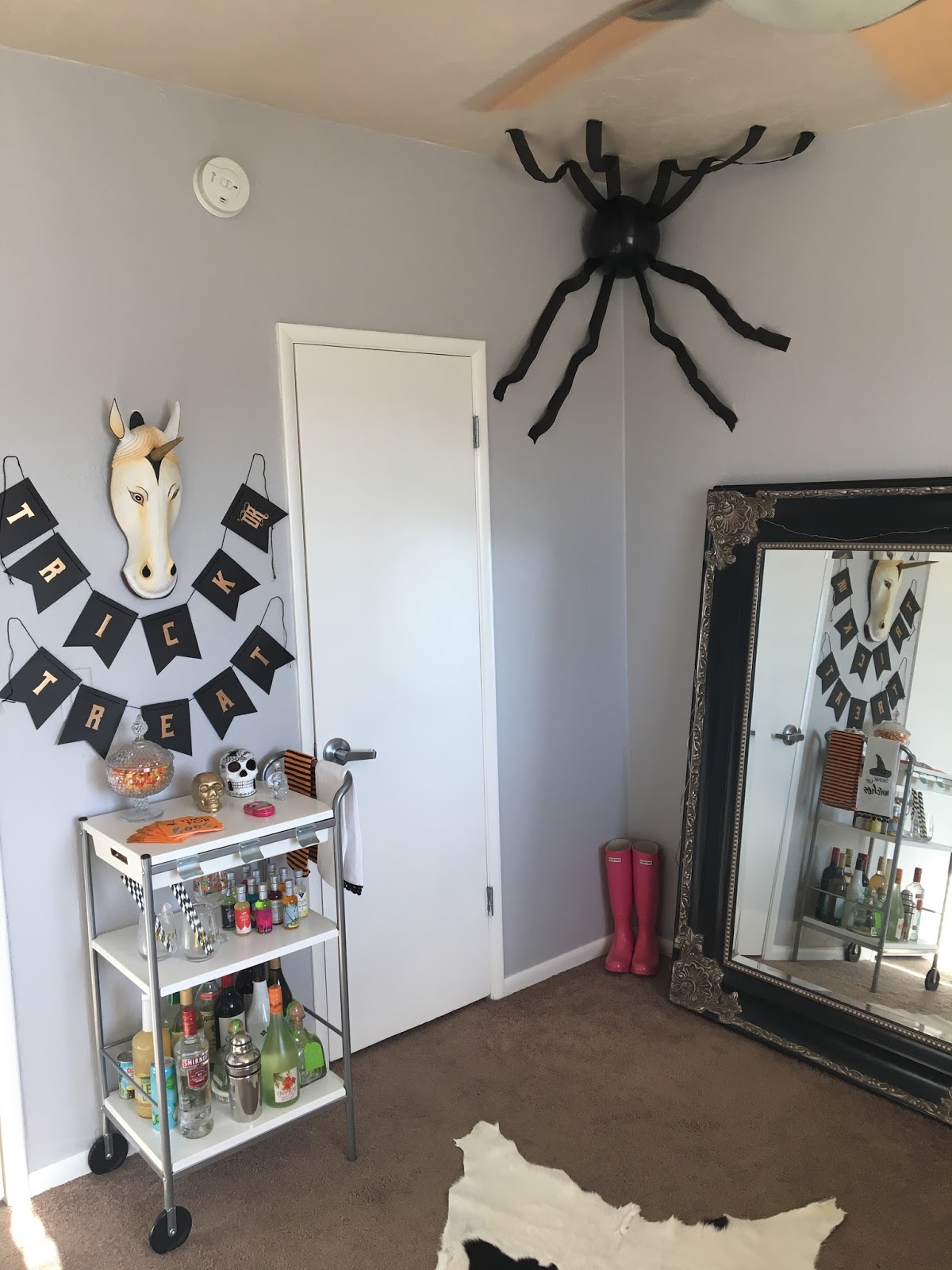 Lastly, my mom found the spider decoration on Pinterest and it is so simple. It requires 8 pieces of black streamers and 1 non-helium balloon, tape it all together in a corner and you have a creepy little visitor! How do you decorate for Halloween?