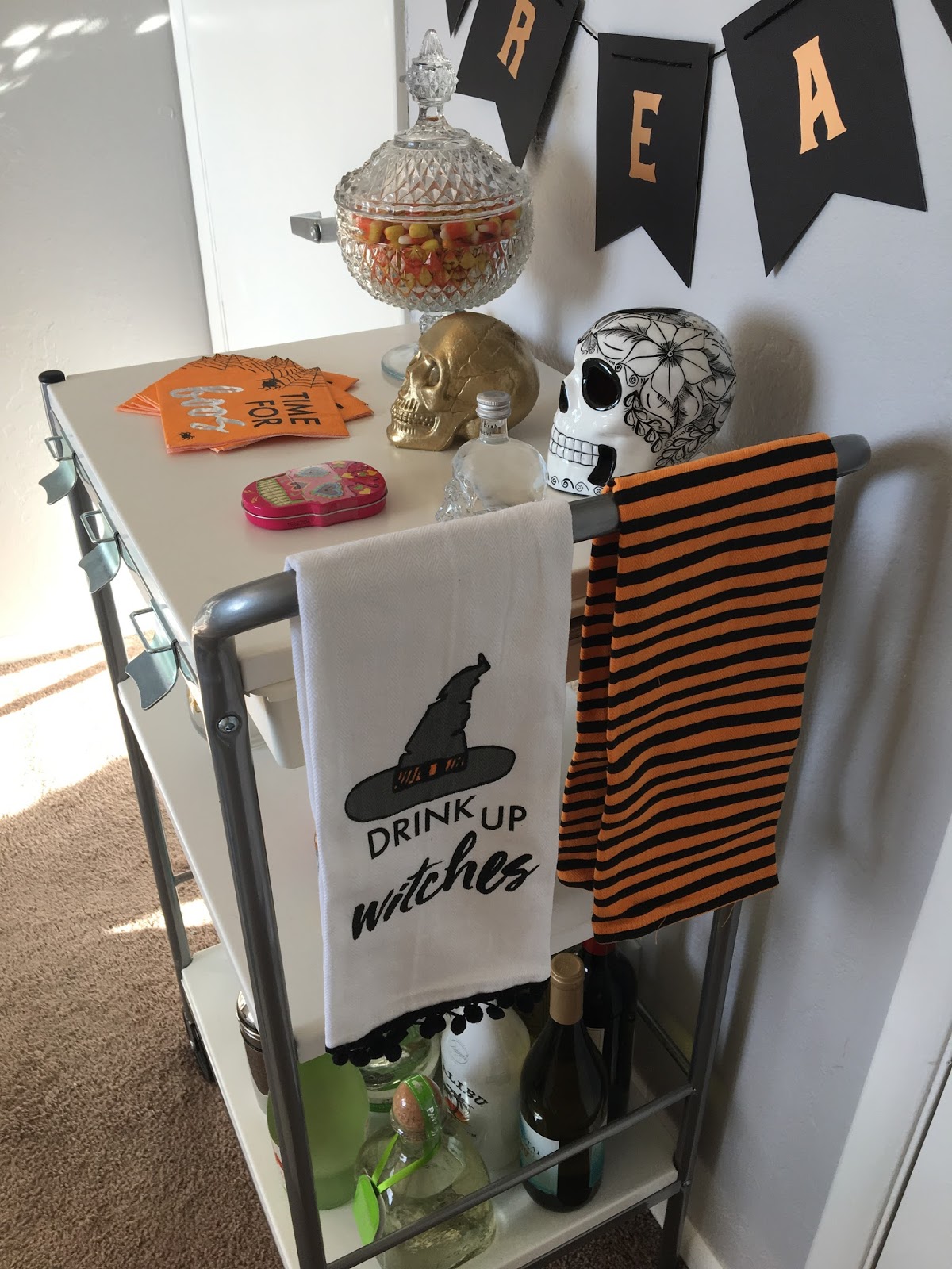 October\’s cart features two Halloween themed tea towels, a candy corn filled dish, sassy napkins, a few decorative skulls, glasses, and of course liquor (look how cute the global mixer set is)! My favorite place to find holiday items to add is the Target dollar section, but I\’ve also linked some similar items I love that can be ordered at the bottom and the Swoozie\’s website has tons of goodies too.