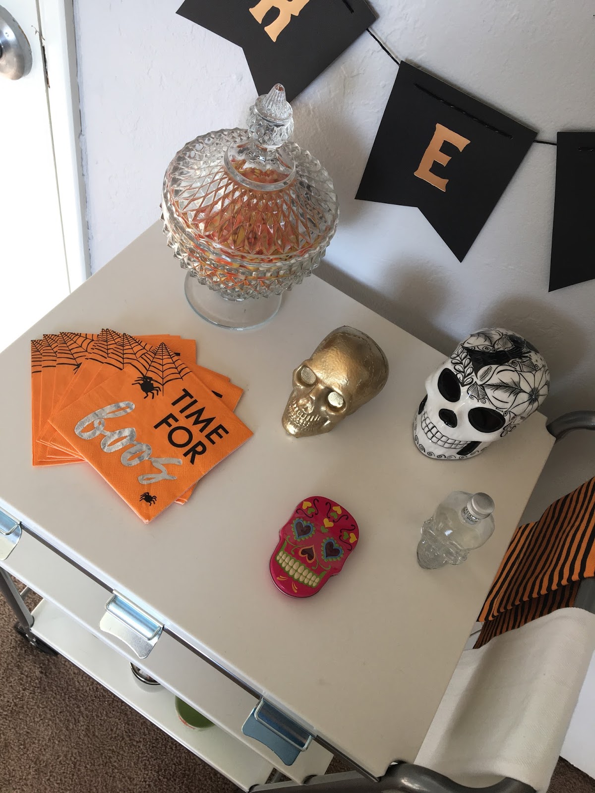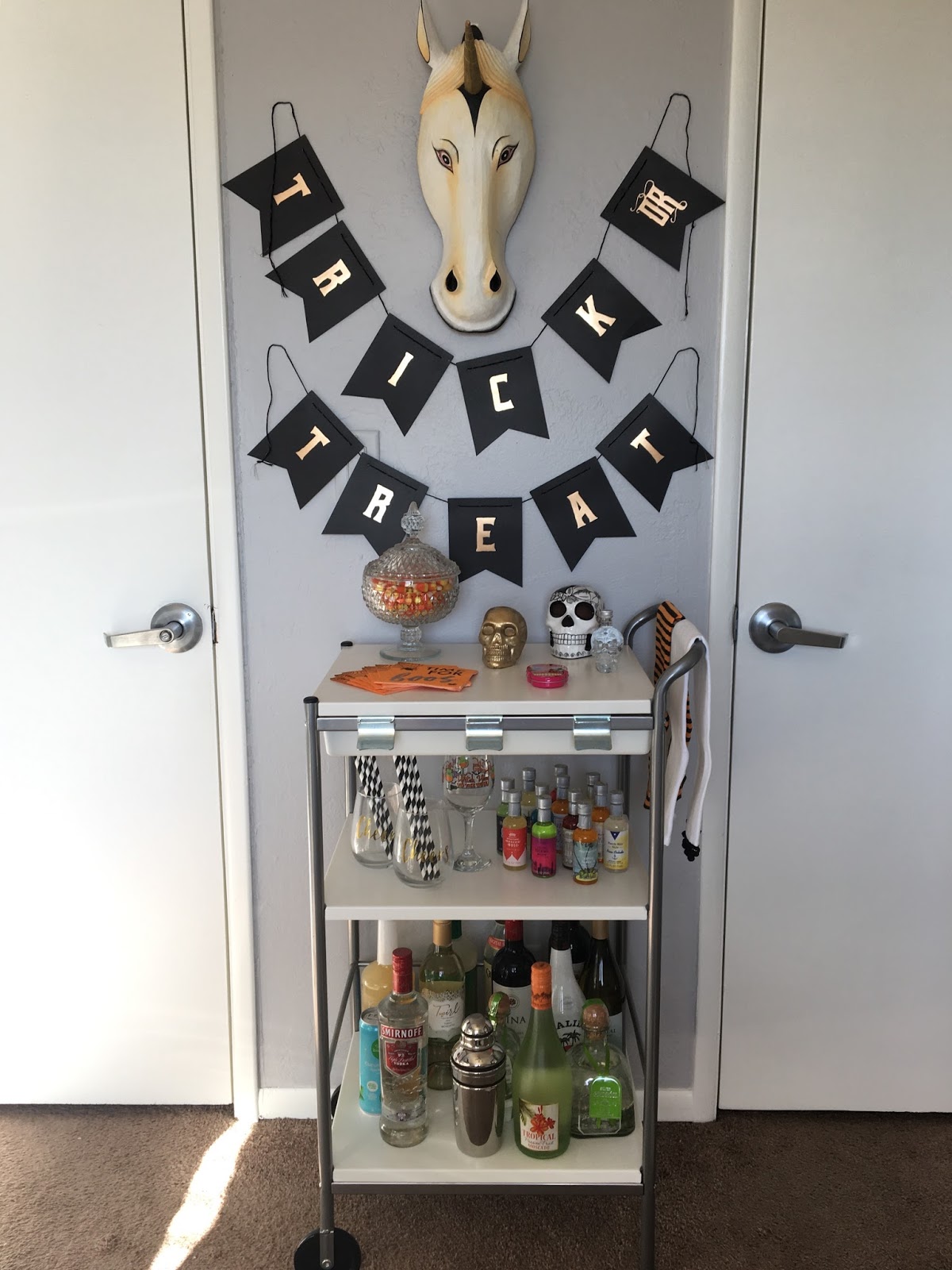 My favorite part of upcoming holidays is changing up my bar cart decor. I spent the past two years finding little things to add to my collection until I could finally have the cart in my room. Now it\’s in my room and looking spookier than ever this month!