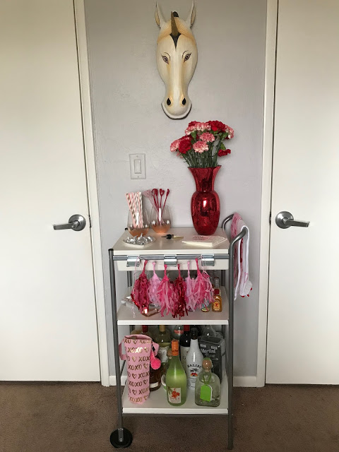 I got a little over excited and changed up the bar cart early this month because I just couldn\’t wait for all the cute things I had saved for this one! It\’s Valentine\’s Day themed with all the pink and red one little cart can handle.