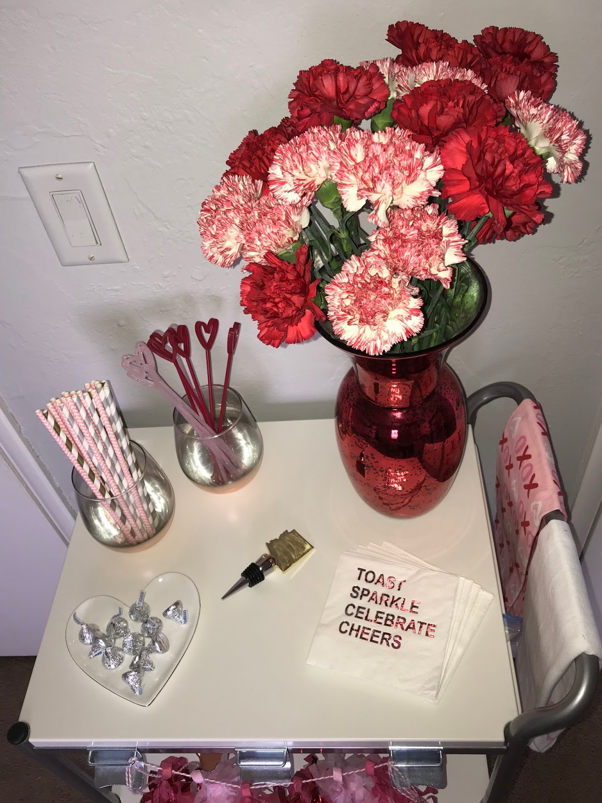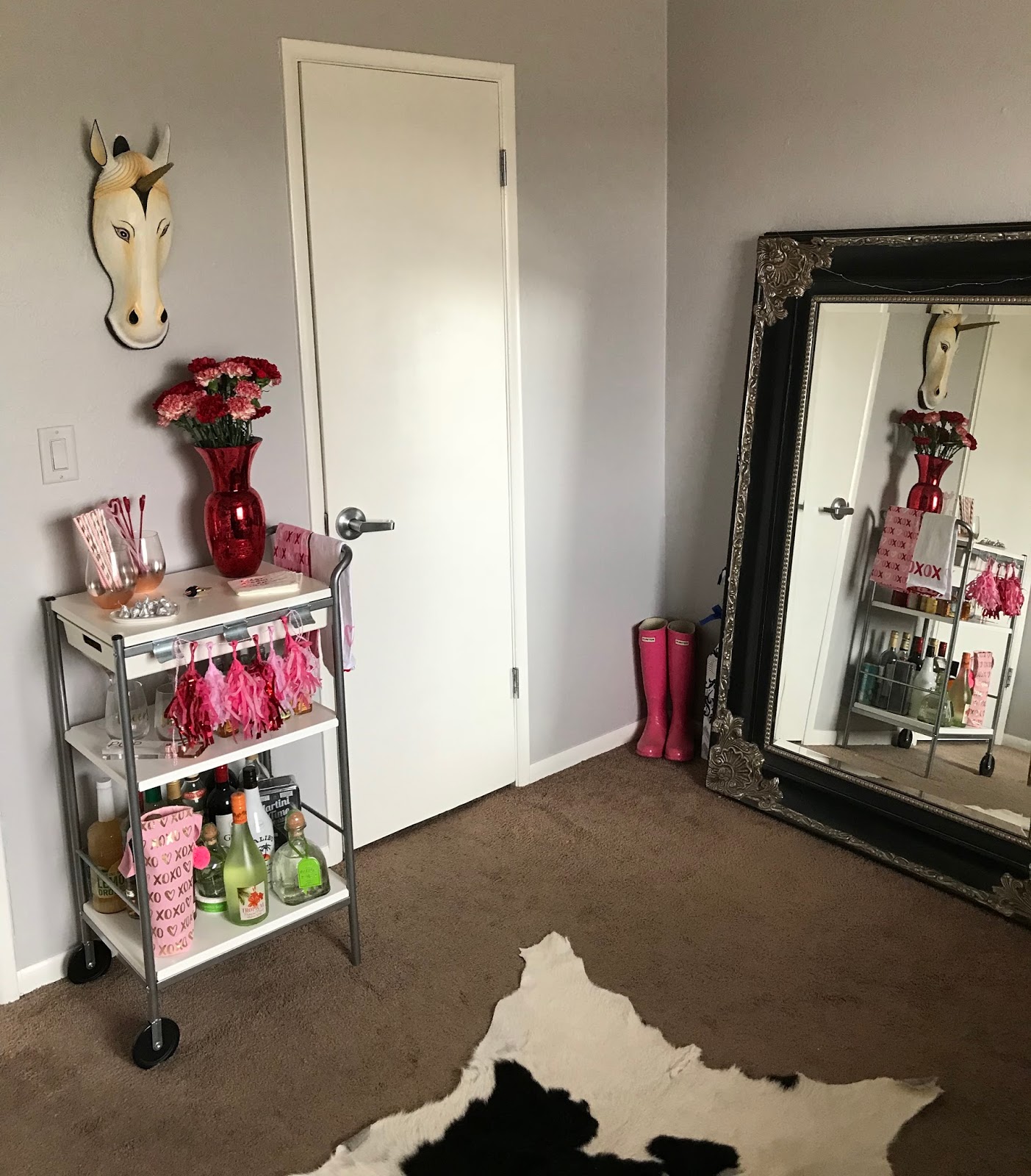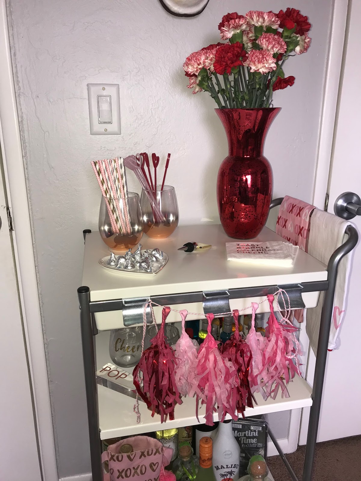 I got a little over excited and changed up the bar cart early this month because I just couldn\’t wait for all the cute things I had saved for this one! It\’s Valentine\’s Day themed with all the pink and red one little cart can handle.