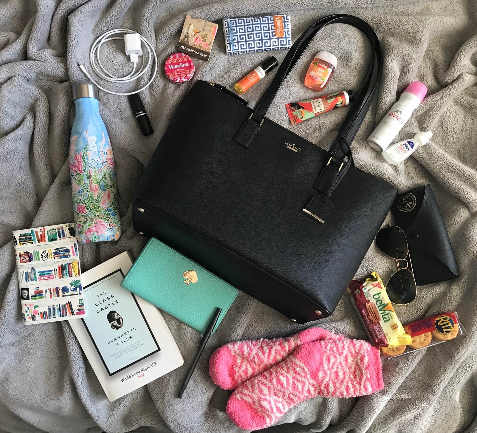 I usually only travel with a tote (this Kate Spade Cameron Street tote is the perfect size!!) and a small roller bag, so the tote is always loaded to the brim. First and foremost, I bring lots of snacks like peanut butter crackers and Bel-Vita bars. These are perfect for traveling because they\’re small and non-perishable, but still keep you full if you can\’t grab real food without being super unhealthy. Another must-have is a notebook and pen because you really never know when you might need to jot something down or leave a note. This set is small and so cute to keep in your purse, I got a different color combo and love them! You can\’t forget the everyday things like sunglasses, your wallet, a book, a water bottle, and your charger too.