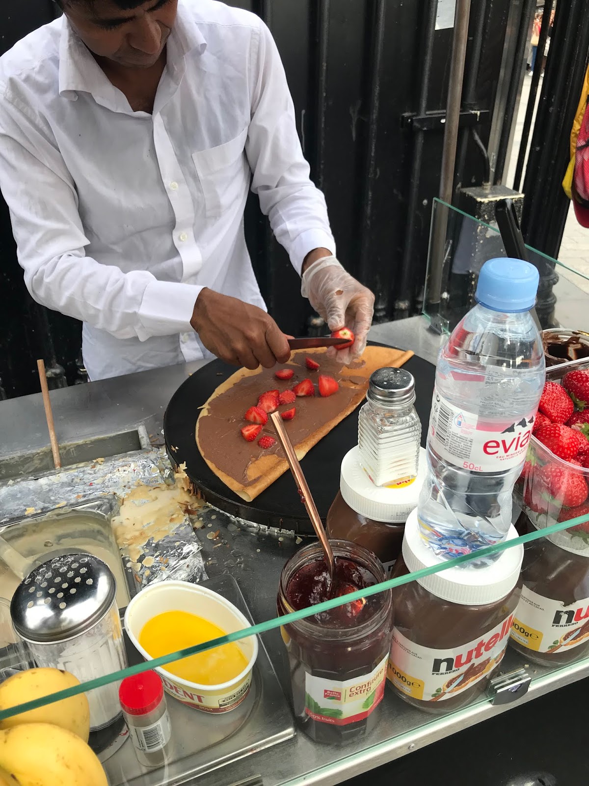 To celebrate the fact I made it up to the top we got French crepes from one of the carts on the corner of Champs Elysees, they seem to always be there in the evenings. I ordered Nutella with strawberries, my mom got Nutella with bananas. It was so cool because he actually makes them right in front of you and they tasted incredible!