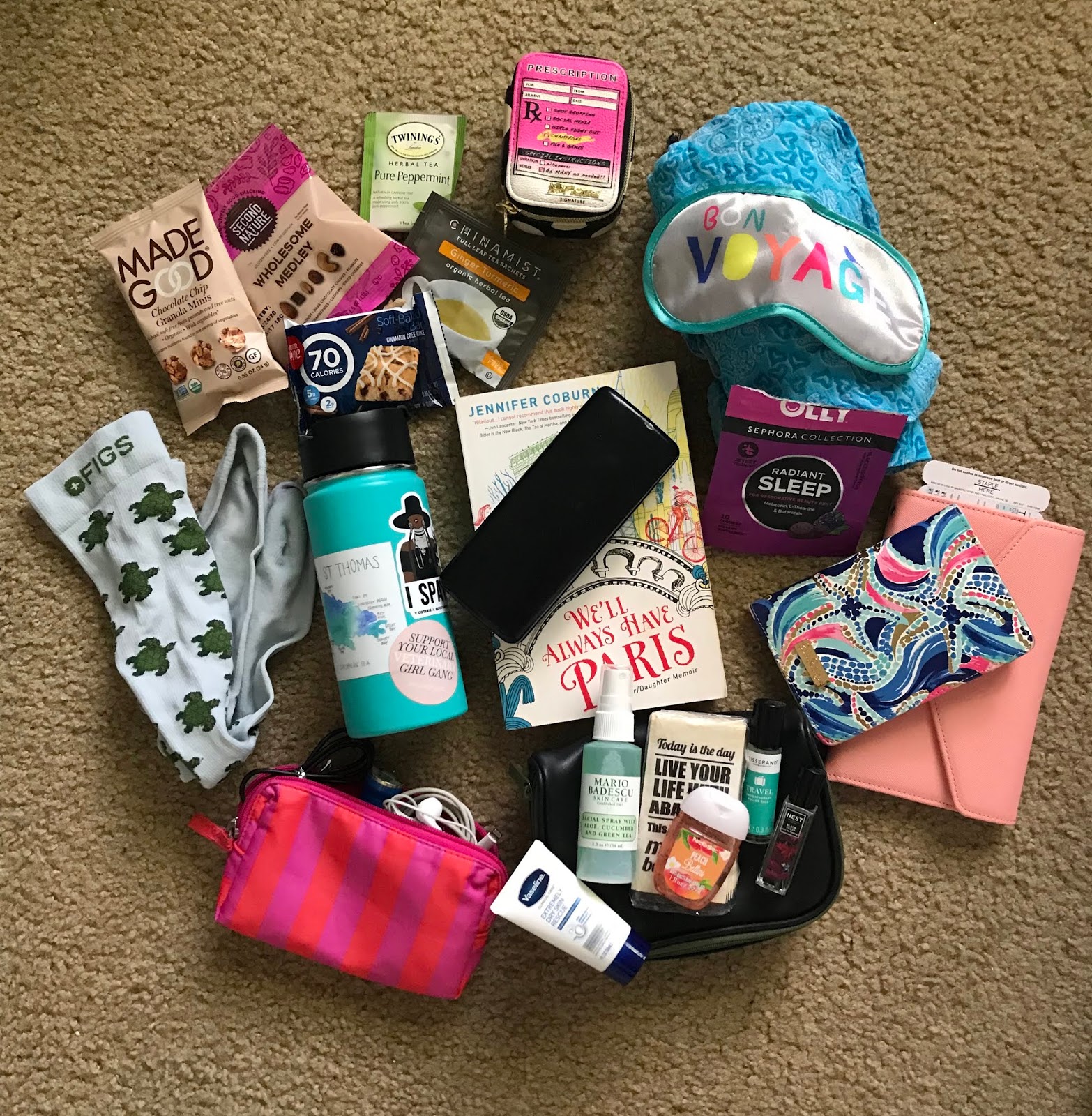 • Cosmetic bag filled with facial mist, makeup wipes, eye balm, eye drops, tissues, sleeping mask, hand sanitizer, tampons, a hair tie, perfume rollerball, melatonin gummies, Poo-Pourri, and hand lotion