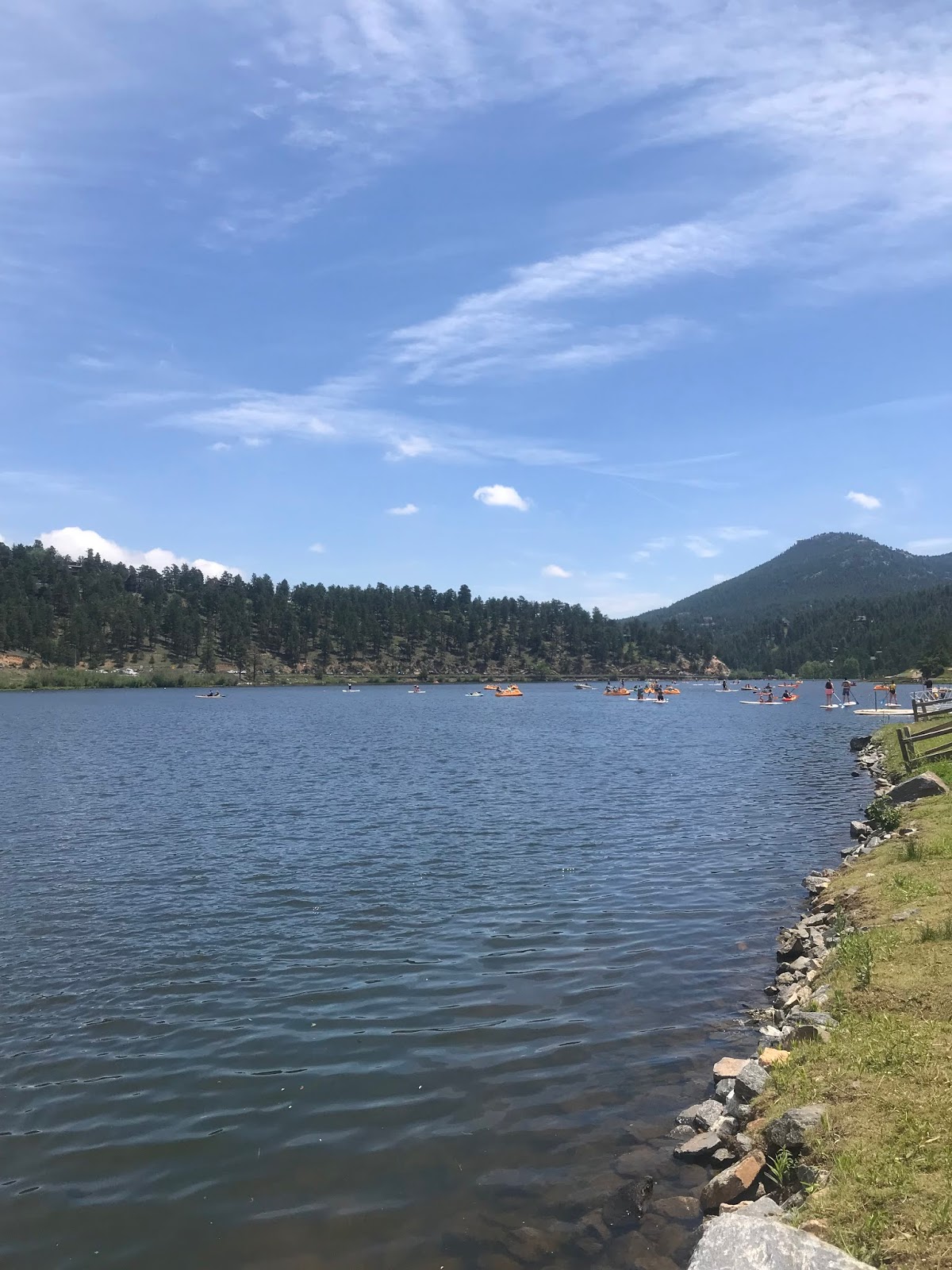 Located right near the Lower Maxwell Falls trailhead is Evergreen Lake. It was a good size and looked very popular so we decided to stop in. There were options to rent kayaks, paddle boards, and paddle boats, along with a golf course across the parking lot. We jumped at the opportunity to paddle board, even though the water was a little chilly, and it cost $20 per person for 1 hour. It’s not a swimming lake so I just hoped I wouldn’t end up wet at all. Since it was July the summer storms start at about 2pm each day and coincidentally we started paddle boarding at about 1:45pm. We stuck out the drizzling rain because it really wasn’t that bad, but eventually were called in because of lightning. I would recommend going early in the day to get the most out of your time, but even with the storm it was still an incredibly fun experience to say I’ve paddle boarded in Colorado! If you’re there in winter instead, they offer ice skating too!