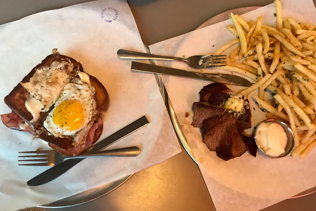 This place was the first food court style market we went to. They have quite a few different restaurants all in one building with a bar and rooftop area. The rooftop views are stunning of the whole downtown area, though it was raining the day we went so we didn’t get to enjoy the rooftop area as much. We opted to order from Bistro Georgette; a croque-madame & steak frites. This was very yummy, but if you’re feeling something different there’s also Mexican, pizza, fish, and southern food options! We also grabbed some drinks from the bar, and while I never figured out exactly what they were called, they have these adult slushy capri suns that just looked like what summer should be made of! If you venture here consider yourself warned, this place is very popular and was packed when we went!