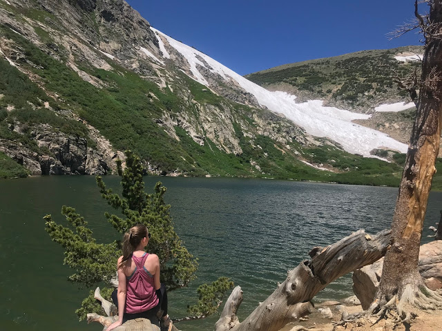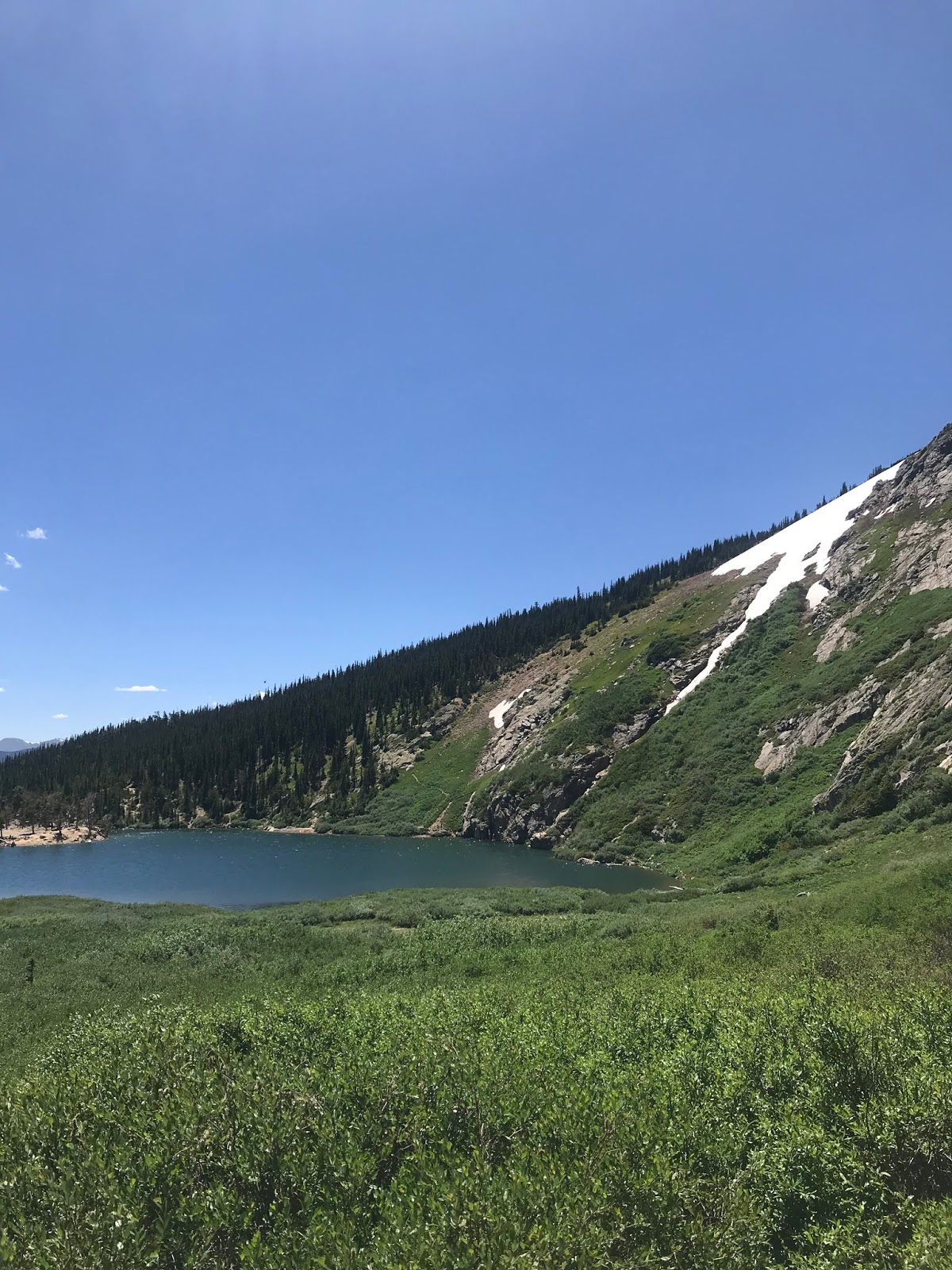 This was the second hike we chose to do and I’m so glad we did! This area was near Idaho Springs, about 1 hour and 20 minutes outside of Denver. You have to pay $5 cash per vehicle to park, but even when we got there around 1pm there was still plenty of parking available. The hike itself is ranked moderate and is 1.9 miles out and back. In the beginning I was slightly intimidated because it is a steep, rocky trail with very little shade. While this does last for about 3/4 of the hike up, it isn’t long at all, and then flattens out. Then you arrive at a beautiful lake with snow on the mountains right past it. We hiked around the lake over to the snow first because of course we needed to really see this snow that existed in the middle of July! There were lots of kids sledding down it, and even a few brave skiers you hauled their skis up the hill and skied back down. We then followed the bottom part of the snow over to some cliffs we had seen people jumping off. This trail wasn’t very well marked so we had to wing it a little to find our way and it definitely wasn’t an area I recommend attempting with kids or dogs. It featured quite a few bushes we had to dodges, rock areas we had to climb, and a tiny little path on the edge of the water towards the end. It was cool to finally reach the cliffs so my boyfriend could jump in (the water was way too chilly for me to attempt it!) since not a lot of people seemed to make their way over there. We were fortunate enough to be there when the water level was high, otherwise the cliff diving could have been very dangerous and we would not have attempted to go over there. Always be cautious when choosing to do things like this and make sure the area is clear of debris or stray sticks and rocks. In total we spent about 2 hours on the hike, though many people seemed to spend a good portion of the day there! If you wanted to pack a lunch it would make for a great picnic area.