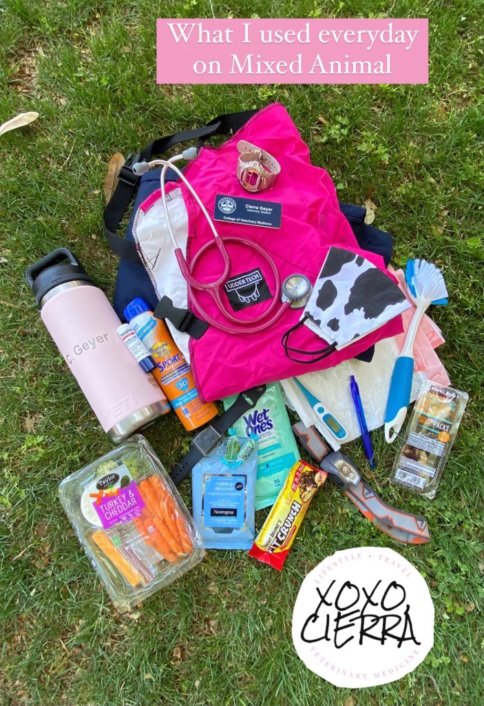 The time I’ve waited for these past 3 years has finally come, I am in my clinical rotations! I am so excited to take you all along with me during this next year while I finish out veterinary school and explore so many different areas of veterinary medicine. To start, I want to share a peek into my clinical bag I used during my mixed animal ambulatory rotation. Ambulatory is just fancy wording for the clinic works via mobile trucks, rather than out of one stationary clinic building to see patients, and mixed animals means they see everything from cows, to pigs, to goats, to alpacas, to horses, to chickens. I spent two weeks with this rotation and spent the majority of my time driving around with the vets as they saw patients. This meant I had to keep anything I might need with me for the ride or I didn’t have it until the end of the day.